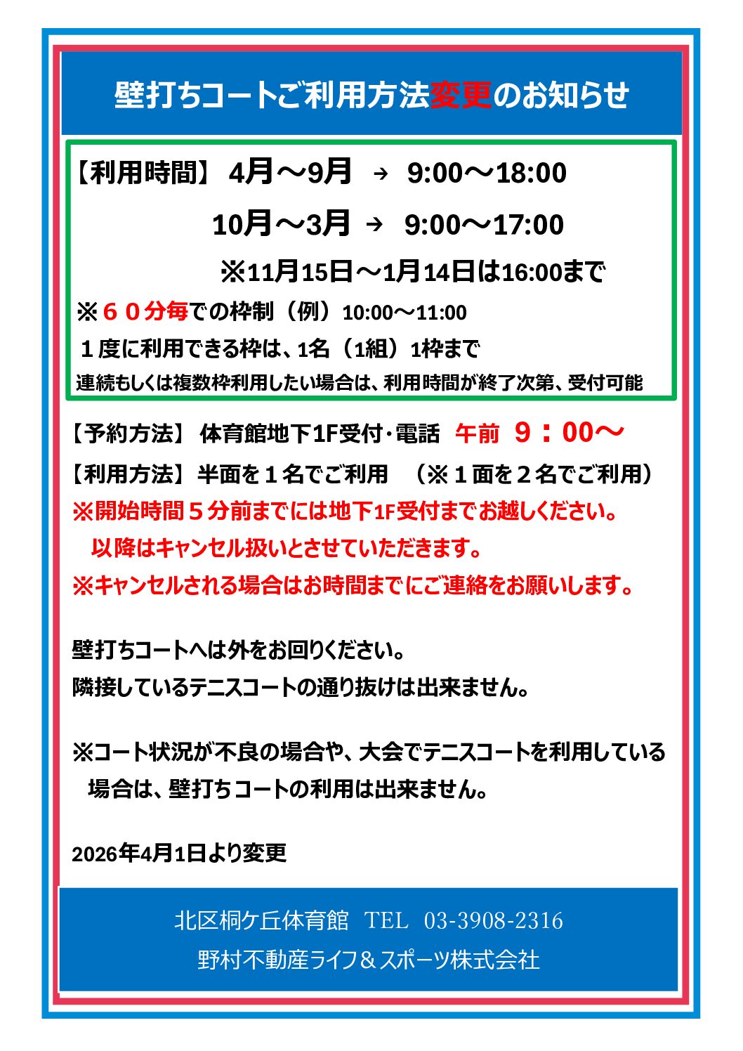■桐ヶ丘体育館 令和8年4月1日~ 壁打ちコート受付方法変更のお知らせ